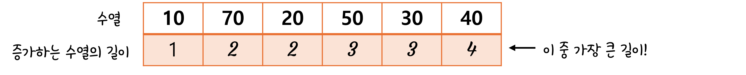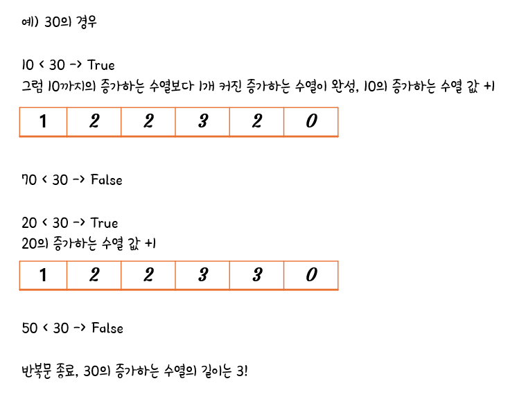 이렇게 구해낸 증가하는 수열의 값 배열 중 가장 큰 값을 찾으면 LIS, 가장 큰 증가하는 수열의 길이값을 구할 수 있다!