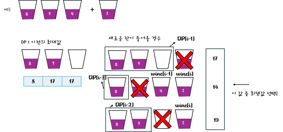 여기서 DP[i-1]의 최댓값은 3잔 연속 선택 불가로 8L와 9L가 들고 있는 잔 2개를 선택하는 경우다.