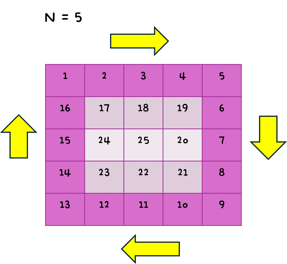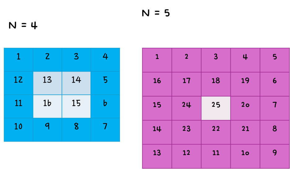 이걸 함수로 만들어서 바깥쪽부터 안쪽으로 각 단계를 밟아 채워나가는 방식을 (N-1) // 2번 반복!