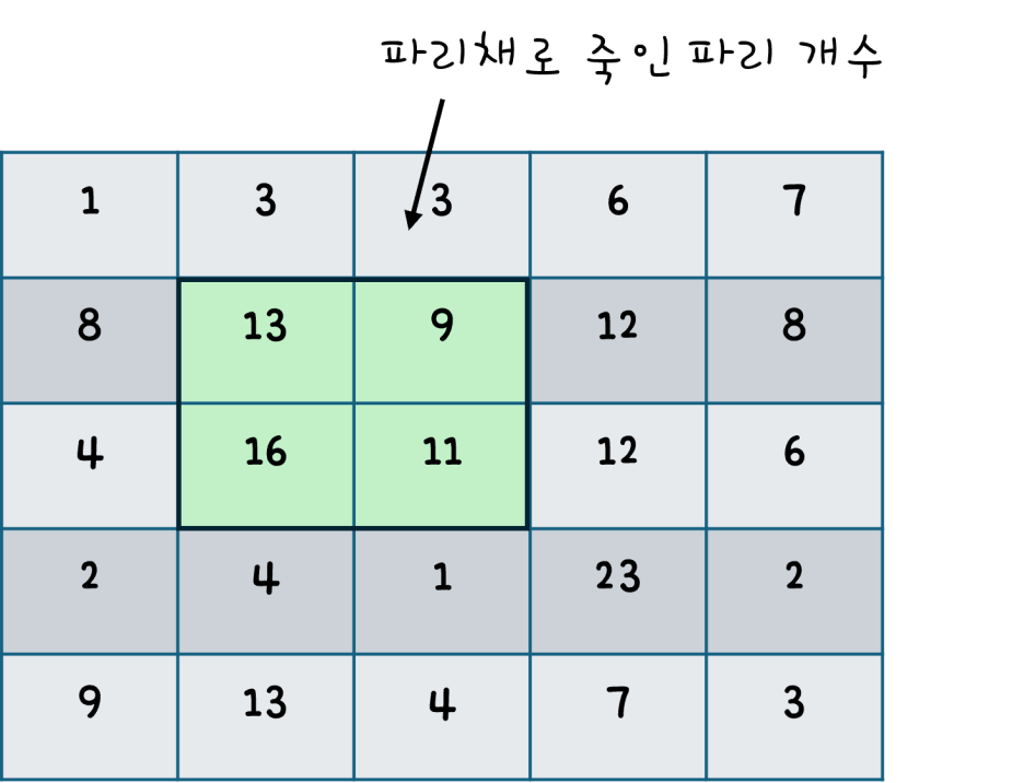 N x N 크기의 파리의 수가 저장된 배열이 있다 하자.
