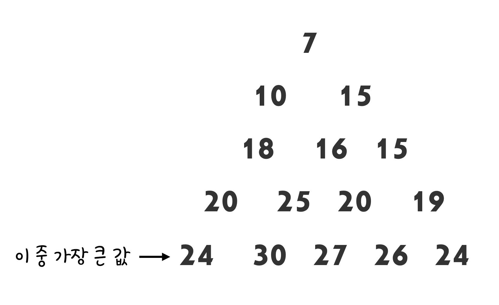 A[i][j] += max(A[i-1][j], A[i-1][j-1]) # 부모값 중 큰 값 더하기