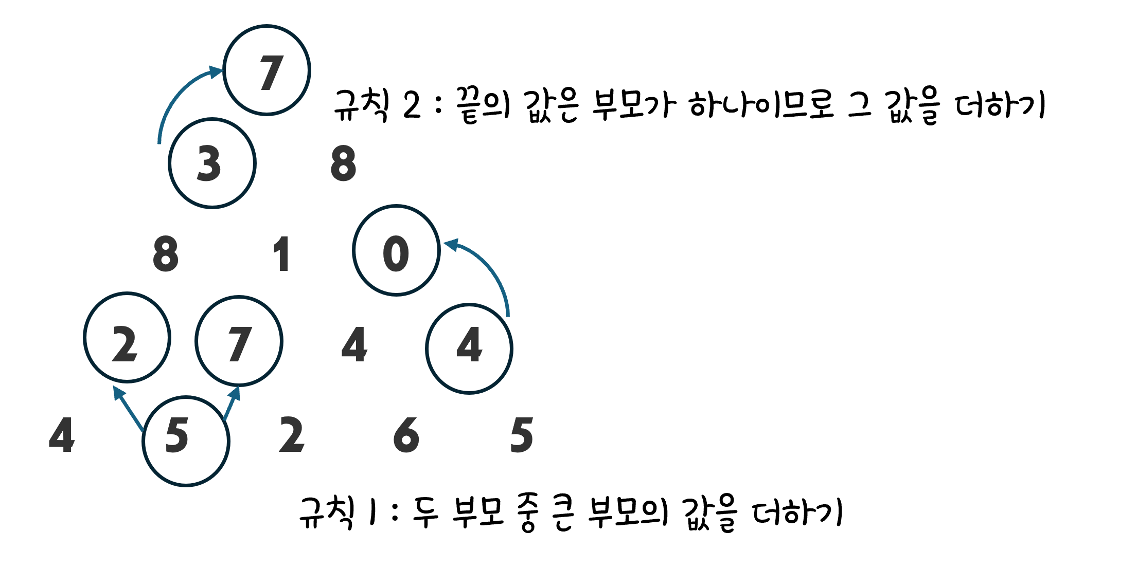 자식이 선택할 수 있는 부모의 값은 2개, 그 중 가장 큰 부모의 값을 더한다.