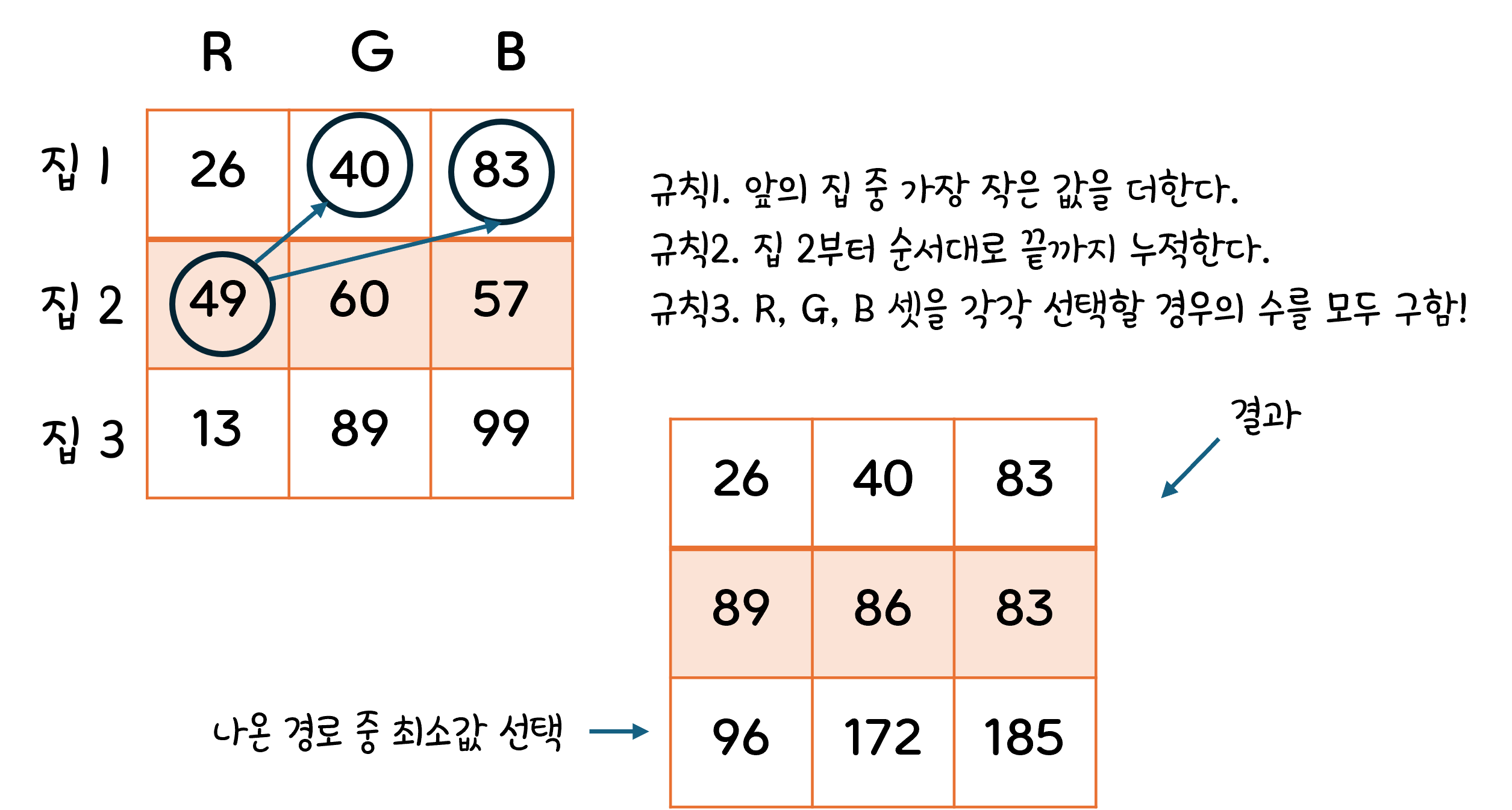 그러니 R, G, B를 각각 선택했을때의 경로를 누적해서 더하여 가장 최소인 경로를 골랐다.