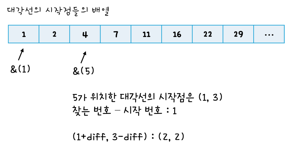 그럼 (x, y)의 경우엔 (x+y)-2번째 위치의 값이 대각선의 시작점의 수다.