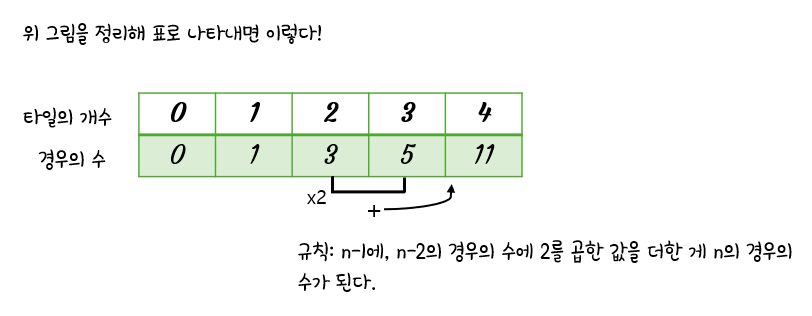 2×n 크기의 직사각형을 1×2, 2×1, 2×2 타일로 채우는 방법의 수를 구하는 문제다.