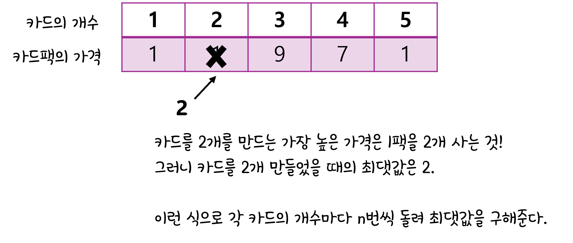 카드를 1개 구매할 때부터 카드를 n개 구매했을 때까지 각각의 최댓값을 메모이제이션해나가며 문제를 푼다.