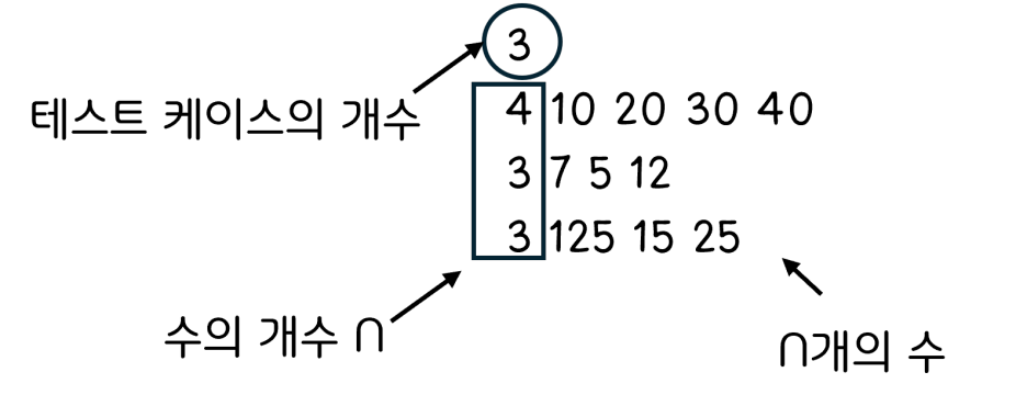 테스트 케이스의 수를 입력받고, 각 테스트 케이스마다 수의 개수 N개와 N개의 수를 입력받는다.