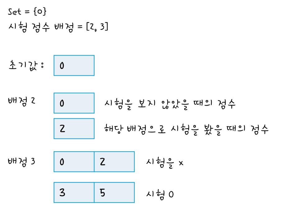 그리고 배점 3이 추가될 경우, {0, 2}에 각각 3을 더해 {0, 2, 3, 5}.